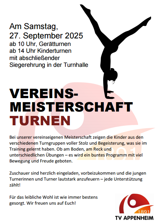Am kommenden Wochenende findet neben dem Tag des Kinderturnens, auch unsere Vereinsmeisterschaft statt. Am Samstagmorgen von 10 bis 13 Uhr zeigen unsere Aktiven ihr Können. Kommt gerne vorbei und feuert und fiebert mit.